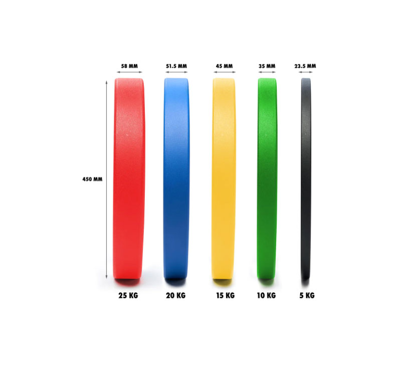 • Medidas por peso: 5 kg: 450 x 23,5 mm; 10 kg: 450 x 35 mm; 15 kg: 450 x 45 mm; 20 kg: 450 x 51,5 mm; 25 kg: 450 x 58 mm